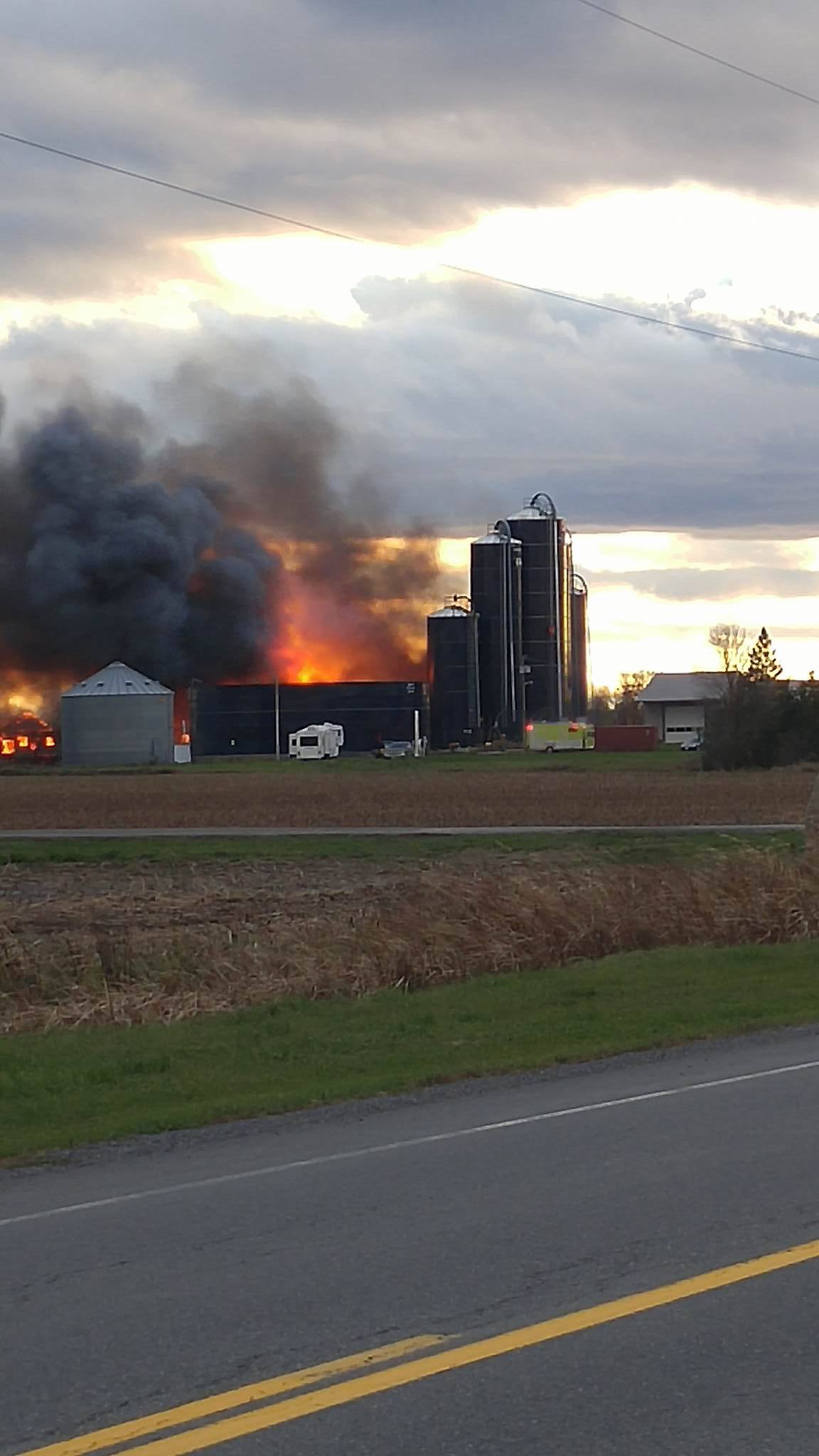 A passer-by took this photo from County Road 24 of the fire raging in the barn at Leducdale Farm on Monday evening at about 5 p.m.