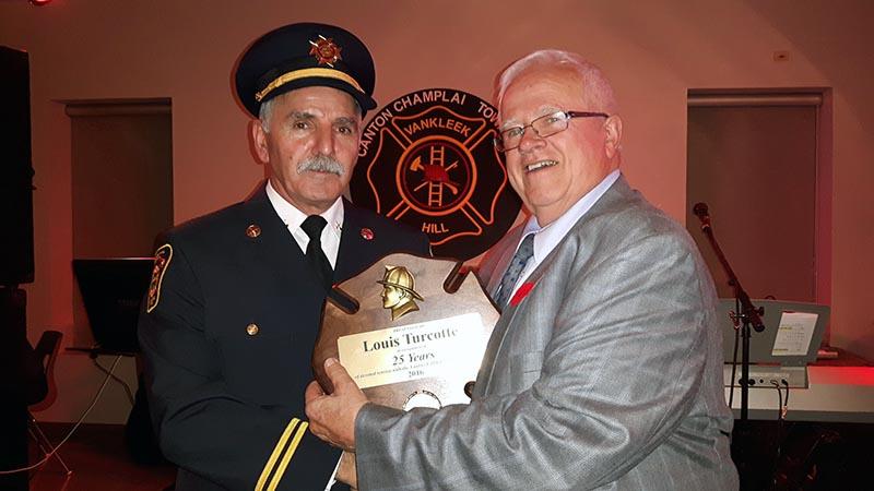 - Vankleek Hill volunteer firefighter Louis Turcotte received a plaque in honour of his 25 years of service with the Vankleek Hill fire department. Champlain Township Mayor Gary Barton presented him with the plaque at the firefighters’ annual dance, which took place at the Vankleek Hill Community Centre on Saturday evening. The event, which was a fundraiser for firefighting equipment, included a silent auction, which raised more than $2,000. (Photo Louise Sproule)