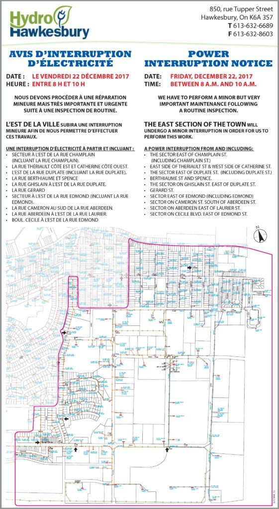 Reminder that Hawkesbury Hydro has scheduled a service interruption on Friday morning, December 22.