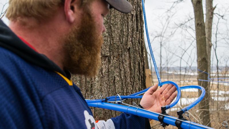 This year, 325 maple trees are tapped using the pipeline. Some of Dandy’s trees are so old that their size allows for three or four taps. The smaller lines go into a lower, wider main line that’s hooked to the pump. (Photo credit: Cedrik Bertrand)