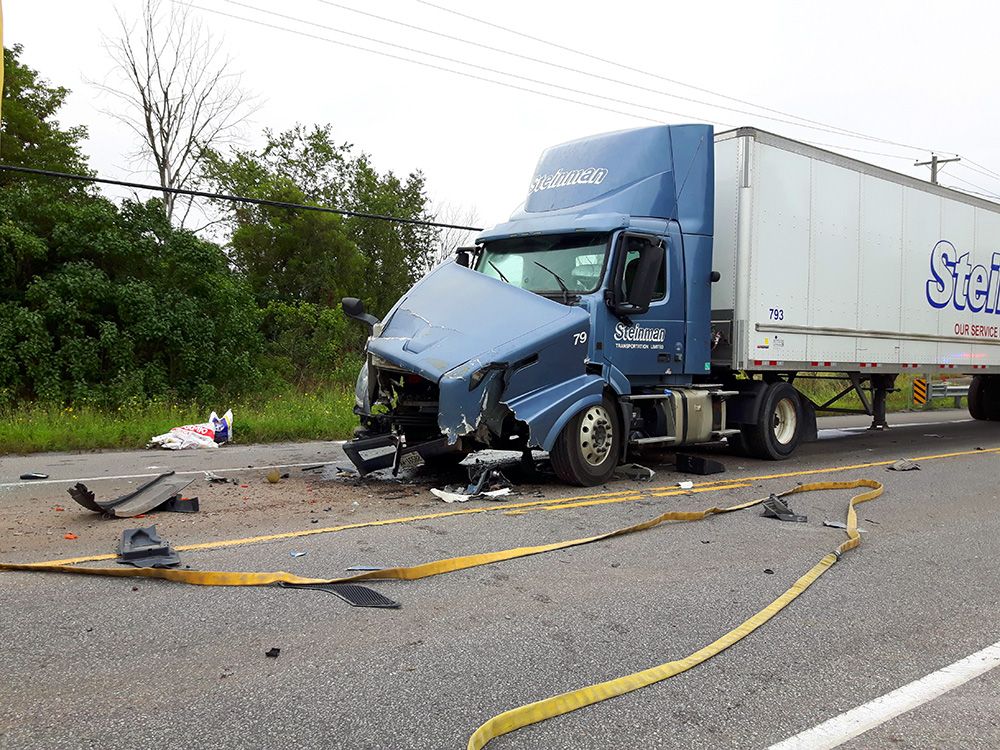 The driver of a tractor trailer, a 51-year-old male from Toronto, has been charged under the Highway Traffic Act with Careless Driving, following investigation of an accident on Highway 34 north of Vankleek Hill; the incident involved four vehicles, including a school bus with children passengers, on September 19.