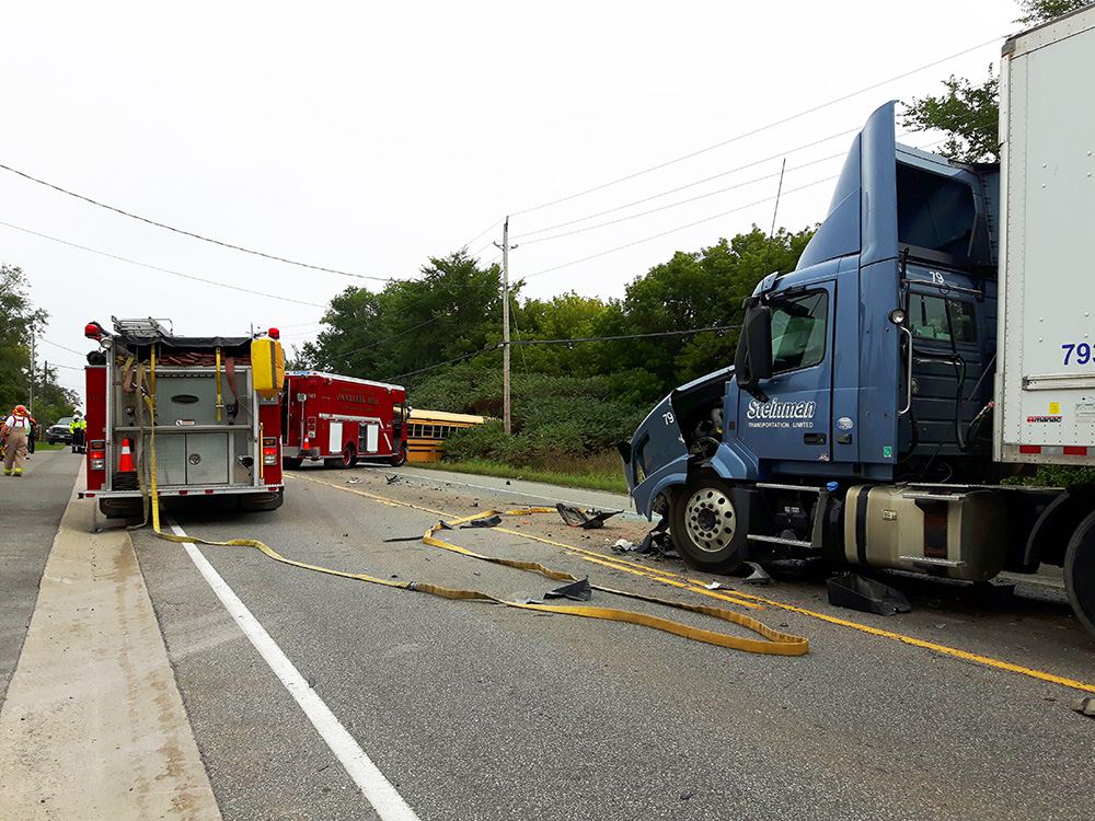 Occupants of other vehicles involved did not sustain injuries. The accident involved two vehicles, a school bus and a transport truck which were all headed north on Highway 34 just before 9 a.m. on September 19.