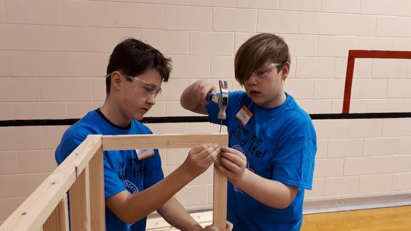 PCPS grade seven blue team students Owen Sergerie, left and Carter Cyr, right assemble their model house, part of the construction challenge at the skills competition. The two-foot by three-foot model frame house had to be able to withstand a 10lb. bag of sand for two minutes. Fellow team members Mitchell Durocher and Rhett James were nearby going over the plans. Photo: James Morgan