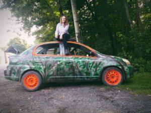 A paint job too good to destroy? Dara Macdonald and her tree-camo Toyota Echo. Photo submitted.