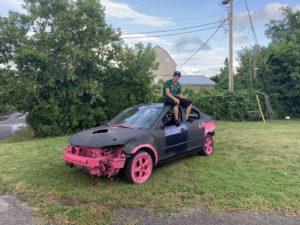 Gabriel Myre atop his Mazda 3 derby entry. Photo submitted.