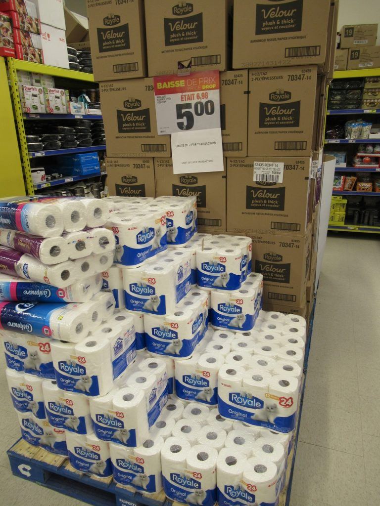 There was some toilet paper in stock at the Maxi in Lachute on Friday, but it was being limited to two packages per customer. Photo: James Morgan