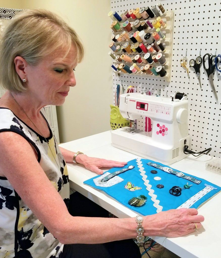 Rosemary Chatterson works on one of her fidget blanket designs at home in Alexandria.