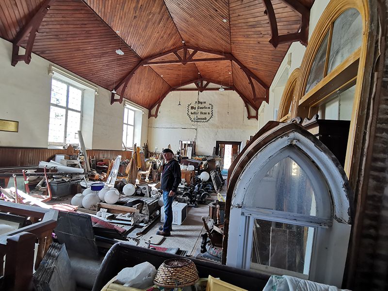 Inside the former church building, Claude Brabant has architectural elements and other salvaged items waiting for use in his projects. Note the secondary ceiling in the church. Above what you see is the original domed ceiling.