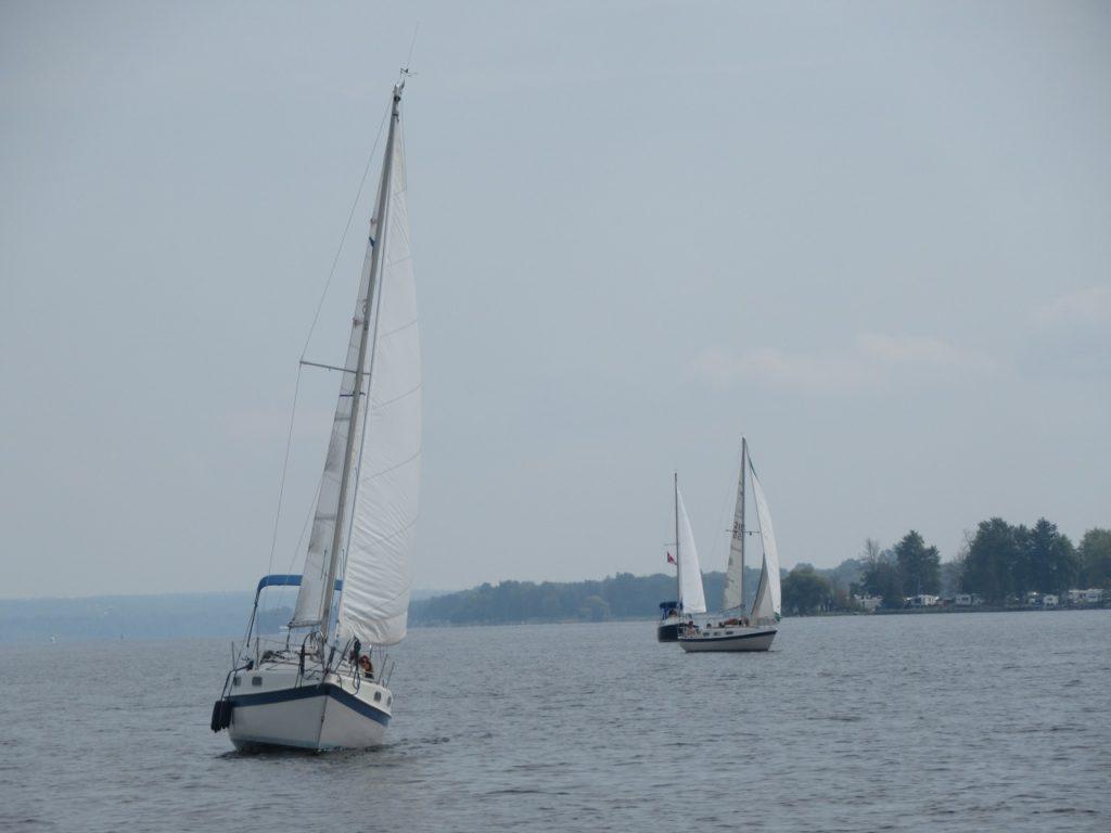 Captains, crew, and passengers gathered at the Riverest Restaurant on Friday evening to go over the rules and logistics. On Saturday morning, a rainshower went through but fortunately ended in time for the vessels to begin leaving the marina. At 11 a.m., the starting horn sounded, and the race was on, two laps around the triangle.