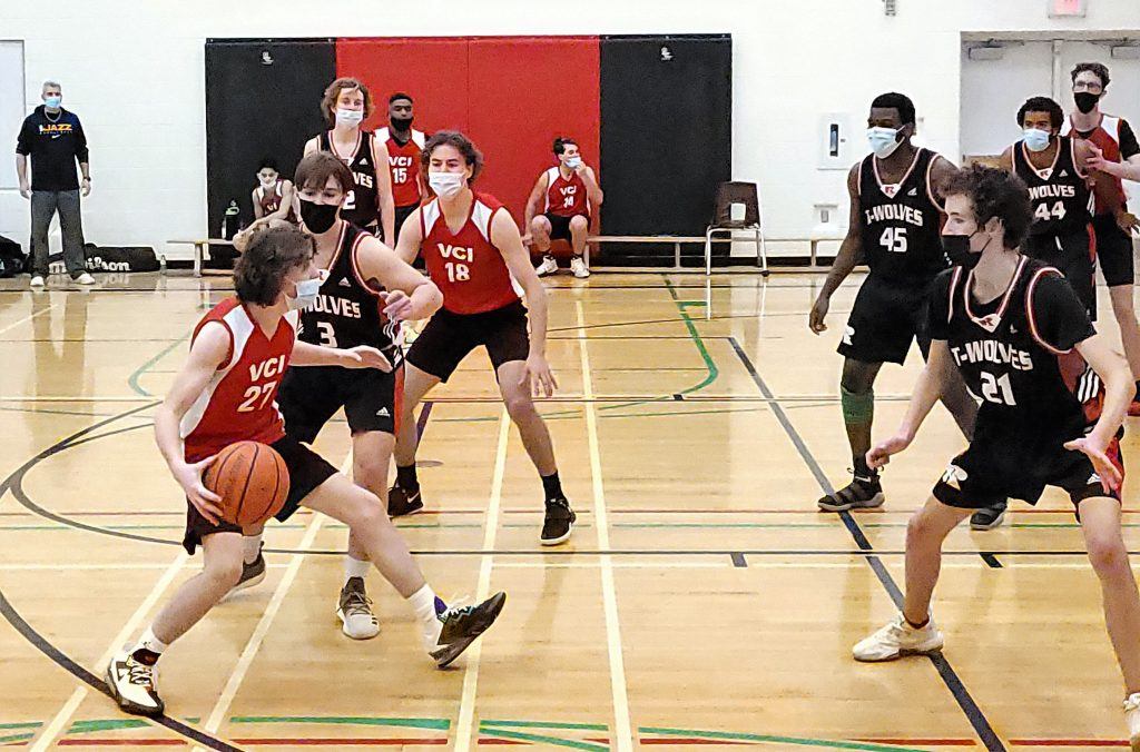 The T-Wolves stifling defence made it difficult for Vankleek Hill to set up its offence. Above: VCI’s Garett Cunning (27) dribbles into a zone defence as Nate Gerow (18) gets in position to set a screen. PHOTO: REID MASSON