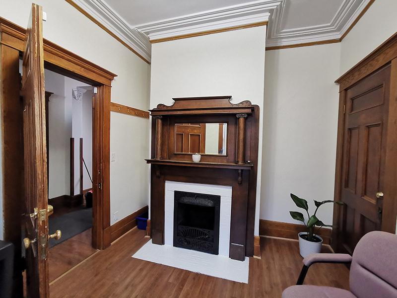 While a beautiful wood fireplace attracts your eye in one of the main-floor offices, a sit-stand desk, keyboard and monitor are at the ready. It could be the perfect place for a business owner or service provider to meet with clients.