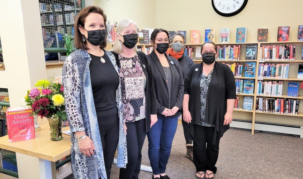 Champlain Library staff are thrilled that the library has reopened to the public. Left to right: Head Librarian Cynthia Martin, Anne Smith, Alicia Heinzle, Christiane Robillard and Shannon Bale. Photo: Reid Masson
