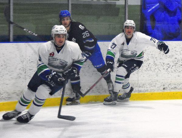 Rylee Hlusiak (9) and Thomas Cusson (27) against Navan. Cusson (27) had a goal and scored the winner in a shootout, as Hawkesbury beat Navan 3-2. Photo: Sylvain Lauwers