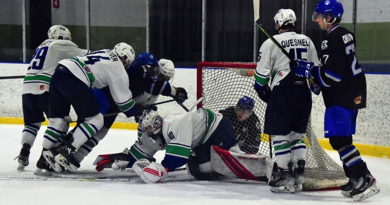 Hawks goaltender Matthew Tovell dives to cover the puck as Josh Spratt (29), Reid Oliver (14) and Jeremy Quesnel (15) keep the front of the net clear during Hawkesbury’s 3-2 shootout win over Navan on Friday, March 25. Photo: Sylvain Lauwers