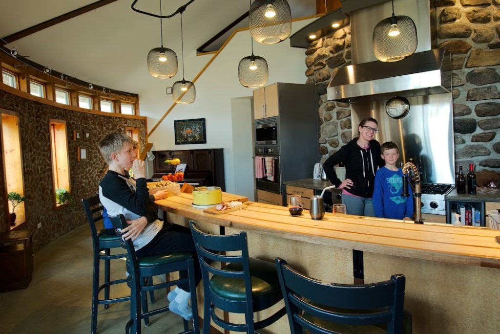 Aidan Burgess works in the kitchen with her sons, Dawson (left) and Oakley (right) around the curved island of maple and cherry wood. Photo: Greg Byers