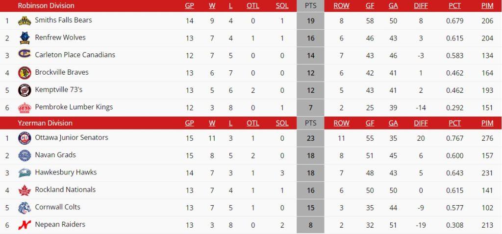 Despite the two shootout losses, Hawkesbury – now 7-3-1-3 for 18 points on the season – picked up two points on weekend and remain tied with the Navan Grads for second place in the Central Canada Hockey League’s (CCHL) Yzerman Division. The Ottawa Junior Senators lead the division – and the CCHL – overall – with 23 points in 15 games.