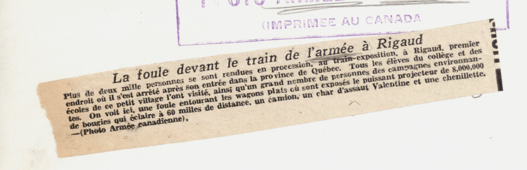 The next morning (February 24, 1942), the train moved on to Rigaud, Québec, where more than 2,000 people, led by the mayor, came out to welcome it. Later that day it proceeded to Ste. Anne de Bellvue, where almost 5,000 people walked through the exhibits – the highest turn-out to date for the tour.