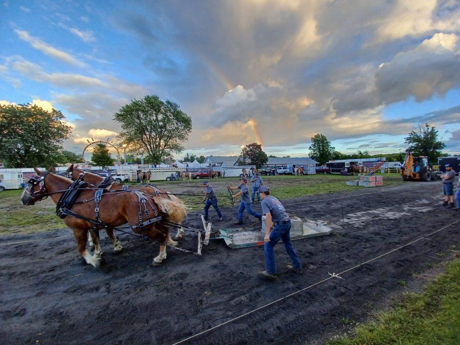 Unfortunately, the weather was not always perfect during the fair. Frequent rain showers hit on Friday and Saturday, making areas of the fairgrounds rather muddy. On Friday evening, the rain was over just in time for the Horse Pull and a rainbow appeared as a backdrop for the event. Rain later on Friday night unfortunately turned the infield area into soupy mud and the heavy horse hitch events on Saturday had to be cancelled.