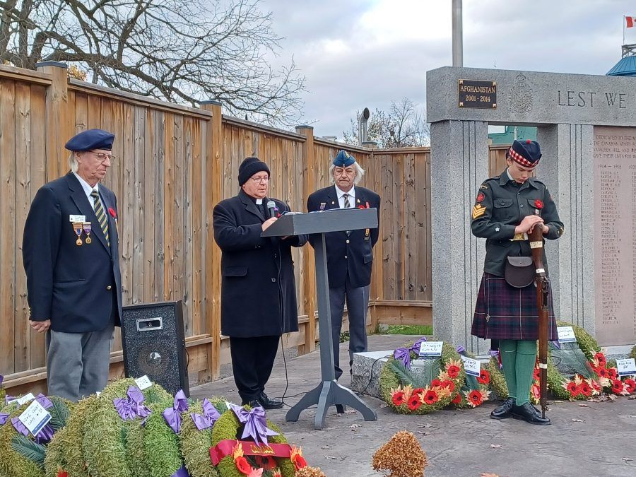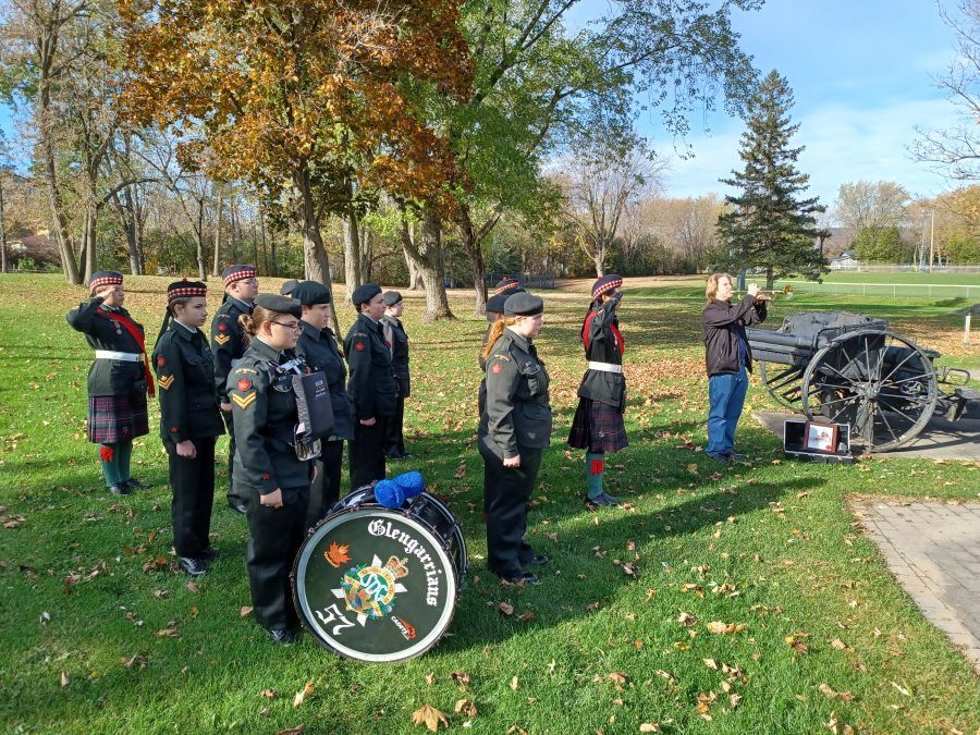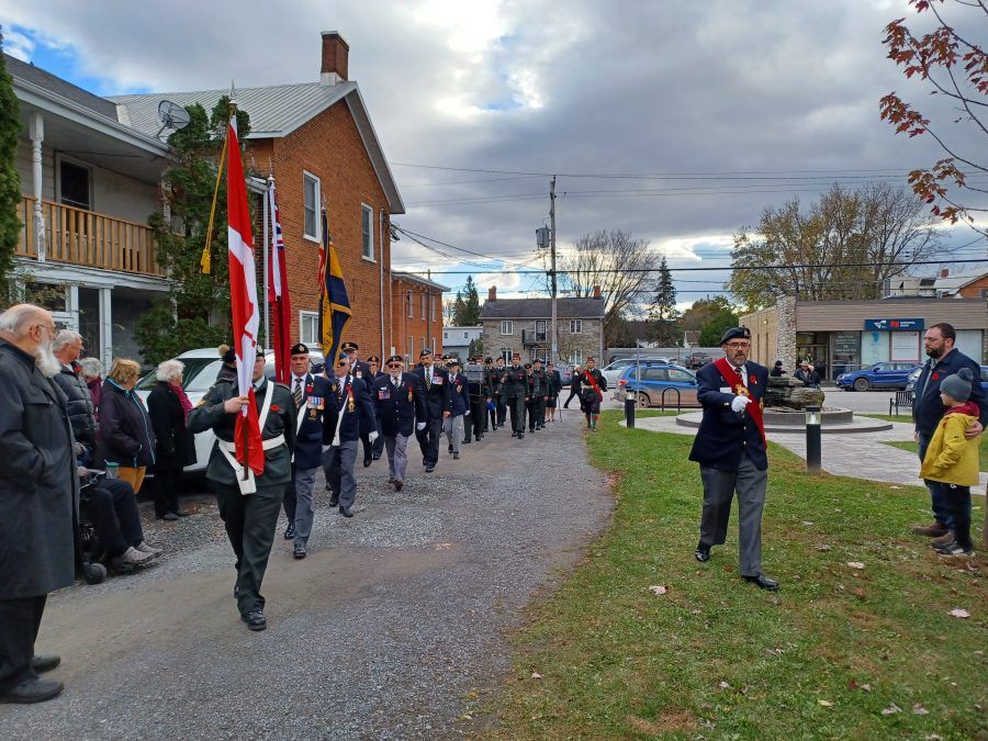 Residents of Vankleek Hill and L’Orignal took time to remember those who have served Canada at war, and during times of peace as veterans of all branches of the armed forces. With the assistance of Royal Canadian Legion Branch 472 Hawkesbury, ceremonies were held in advance of Remembrance Day on Sunday, November 5 at the cenotaphs in L’Orignal and Vankleek Hill. A legion colour party, and army cadets from Hawkesbury participated in each ceremony. Remarks were delivered by Champlain Township Mayor Normand Riopel at both events. A prayer in honour of military members who died while fighting, and asking for peace was said by Monsignor Léo Villeneuve at the ceremony in Vankleek Hill.
