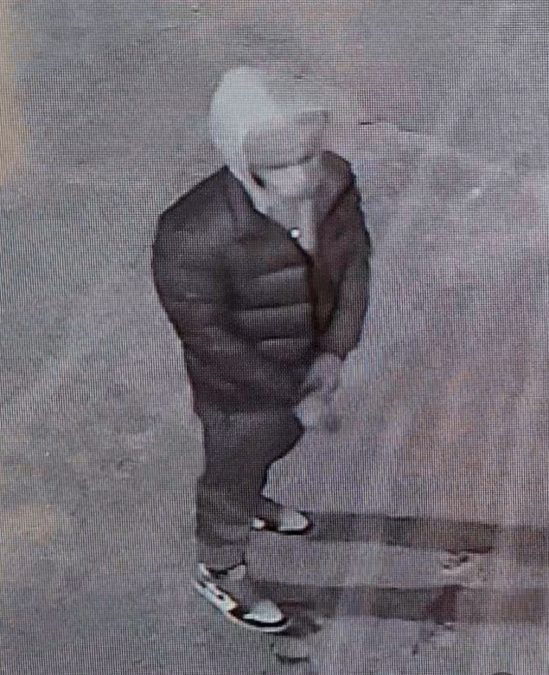 Person of interest #1 was observed wearing a black puffy bomber-style jacket, a light-colored hoodie, a baseball cap, white and black Nike shoes, and what appeared to be a medical mask.