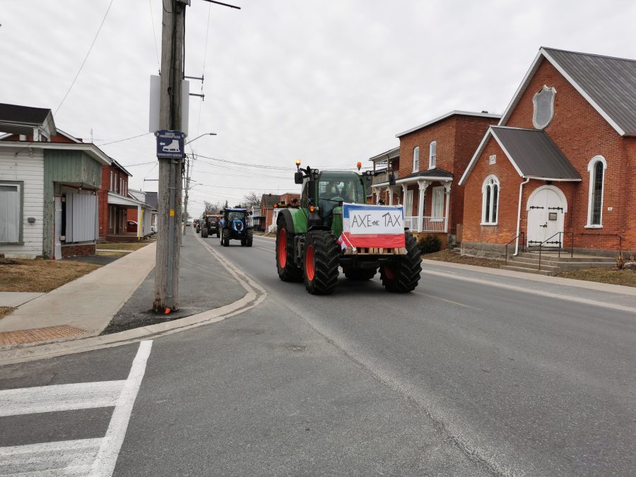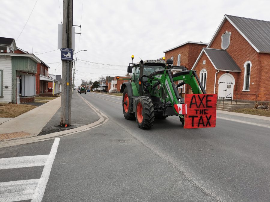 Individuals dissatisfied with an increase in the federal carbon tax demonstrated in Vankleek Hill on Monday, April 1. A procession of tractors, trucks, and other vehicles followed High Street (Highway 34) through town displaying signs opposing the tax and Prime Minister Justin Trudeau.