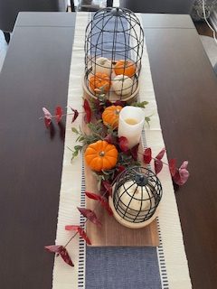 - A wooden long charcuterie board does double duty as a base. I added a couple of metal cloches , mini pumpkins, some fall greenery and a candle and voila! A fabulous fall look for my table created with things that I had around my home.