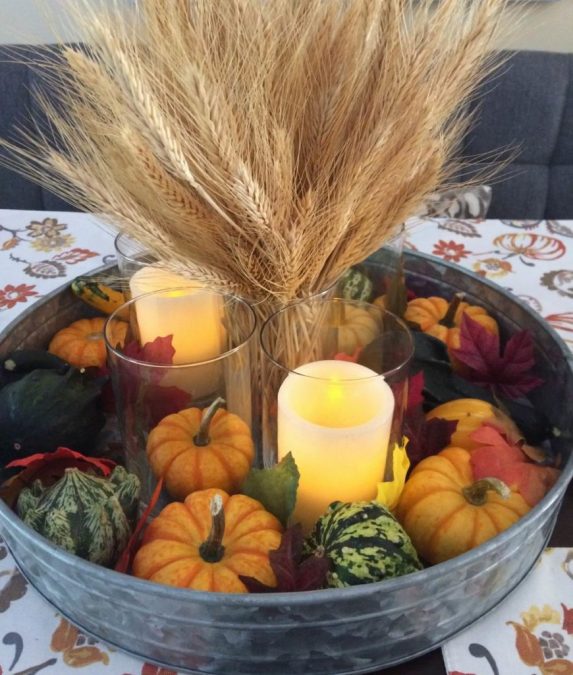Mini pumpkins & gourds, wheat sheaf, candles in glass vases and some greenery create a beautiful look for your table or counter.