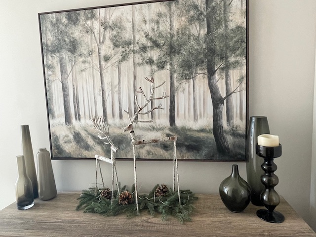 Upper Hall: I love this large artwork and the smoke-grey glass vases on either side of it. I wanted to have a bit of fun and found two metal stick reindeer and placed them standing in some greenery with lights. It’s almost like the reindeer have walked out from the artwork.