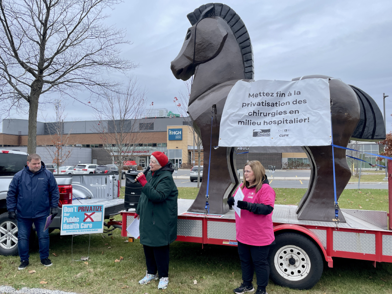 Making its trip through Ontario, the 15-foot Trojan Horse representing the privatization of healthcare stopped in front of the Hawkesbury and District General Hospital on the morning of November 4. The wooden structure has been invoking conversation around the increased reliance on private health clinics in the province, seen by organizers as siphoning funds from the public system.