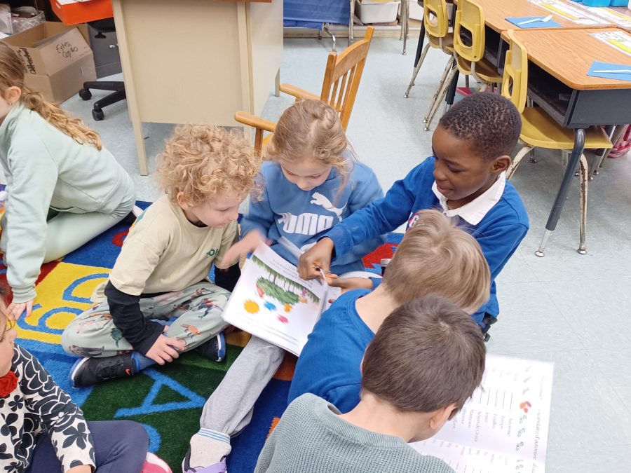 As the newly printed books were distributed to the class, the students happily sat down and read together, excitedly noticing the pages they had written and illustrated.