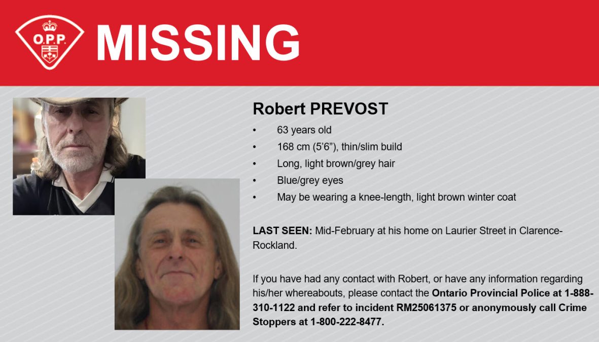 The OPP wants to hear from anyone with information regarding Robert Prevost’s disappearance or whereabouts. Contact the Russell County OPP Crime Unit at 1-888-310-1122 and refer to incident RM25061375. If you wish to remain anonymous, contact Crime Stoppers at 1-800-222-8477 (TIPS) or online at ontariocrimestoppers.ca.