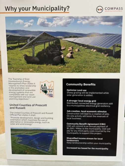 Compass Greenfield Development (CGD) hosted a public meeting at the Chute-à-Blondeau Community Centre on Wednesday, April 23, to inform residents about the proposed Agrivoltaics solar power project near Highway 417 and Gourley Road. The site would occupy approximately 59 acres of land and combine farming and energy production in East Hawkesbury.