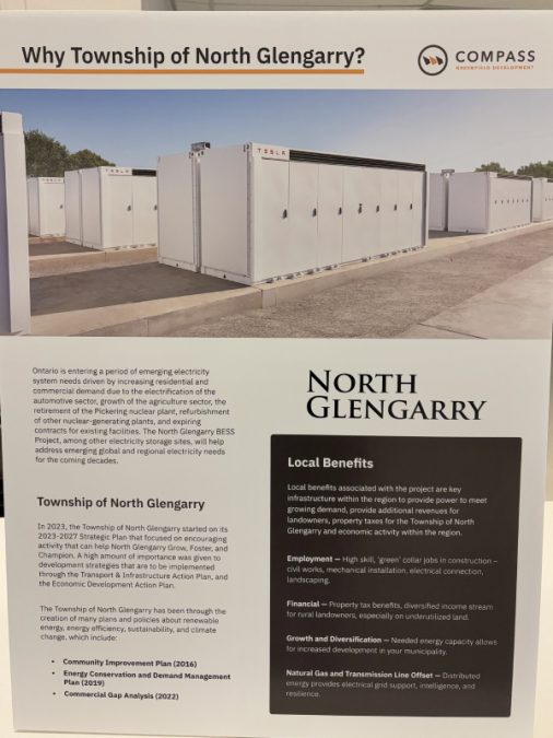 A public information session on the proposed North Glengarry Battery Energy Storage System (BESS) took place on Wednesday, April 30, at the Glengarry Sports Palace in Alexandria. Compass Greenfield Development (CGD) representatives were on hand to answer questions and clarify how the BESS project would impact residents.