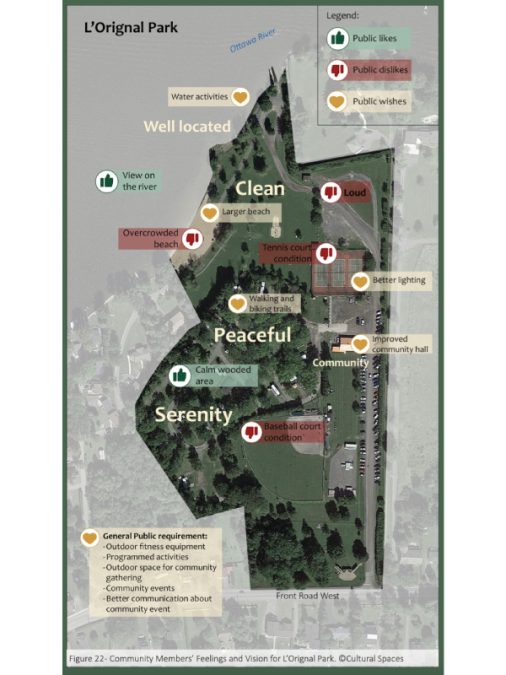 Cultural Spaces composed an image overlay illustration of L’Orignal Park that showcases some of the comments made by residents, highlighting public likes, dislikes, and wishes for various uses of areas within the park.