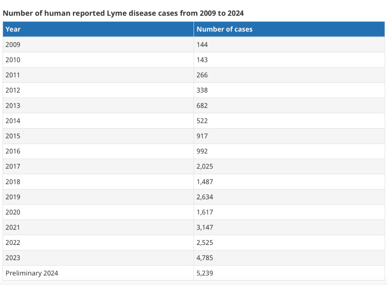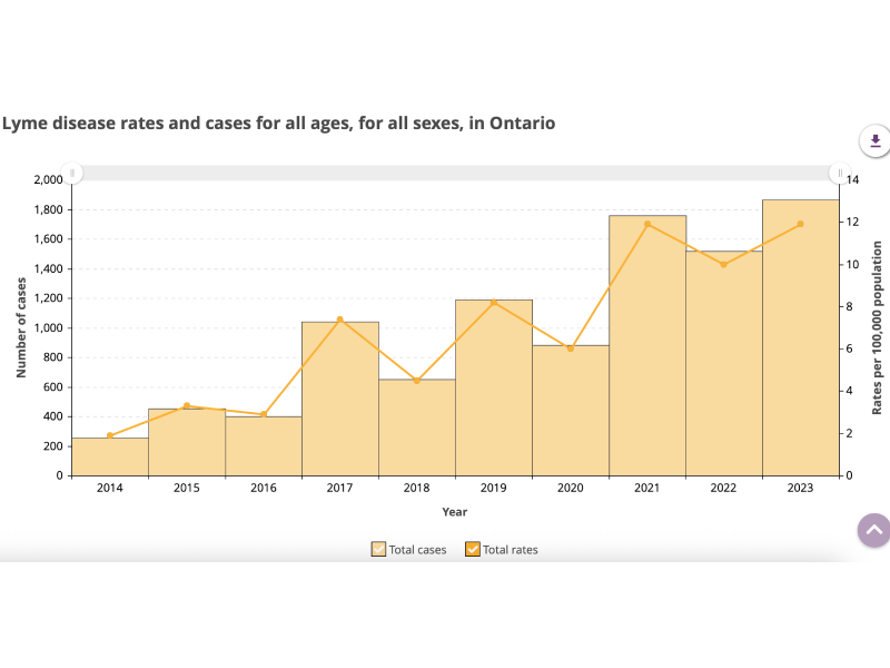 The Québec Ministry of Health (QMH) reported an 11.27 per cent rise in reported cases of Lyme disease between 2022 and 2023, rising from 586 to 652. PHO reported that Ontario cases had increased by 23.02 per cent in the same period, from 1,516 to 1,865.
