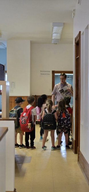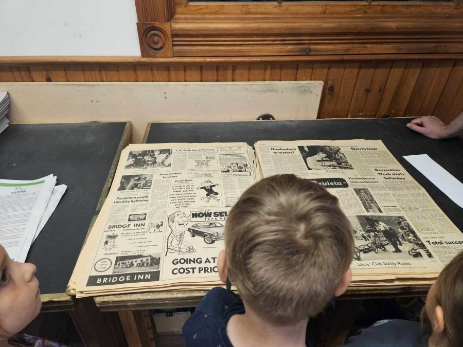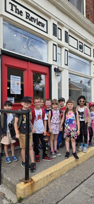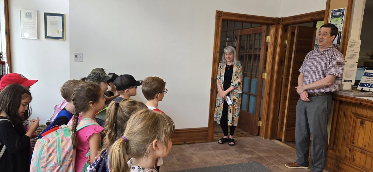 The Kindergarten and Grade 1 class from Pleasant Corners Public School, led by teachers Stacy Schwendemann and Kim Noble learned about news gathering, advertising, subscriptions, and production from the staff. Administrative Coordinator Alison Laliberté told the students a newspaper subscription is just like receiving a magazine like Owl in the mail. Production Coordinator Dorothy Hodge shared with the students about how pages are assembled with the proper graphics, art, and placement of content. Publisher James Morgan told the students The Review is a story of what happens in the community each week and showed them an edition of The Review from exactly 50 years before on Wednesday, June 11, 1975.