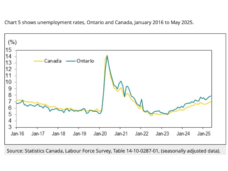 Statistics Canada’s June 2025 Labour Force Survey showed Ontario’s unemployment rate was relatively stable at 7.8 per cent, though employment rose by approximately 21,000 jobs, or 0.3 per cent, following declines in previous months.
