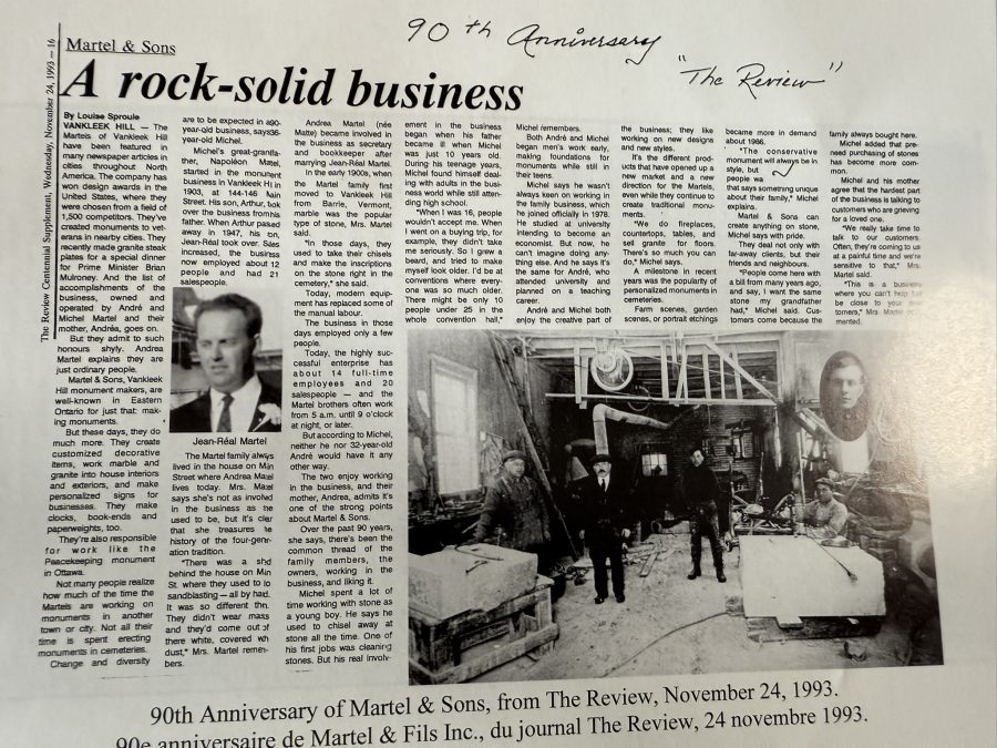 Our next stop was to see Napolëon Martel at 144-146 Main to pick out a headstone for dear grandfather. I hear marble is popular, but we could look at granite Father said. I’ve written out what I’d like on the headstone, but we can have them chisel it right at the cemetery if you want changes. Hard dirty work…all that sandblasting by hand after they cut the slabs with a wire saw and water. Martel monuments would go on to celebrate four generations of a most successful family-owned business winning numerous awards including a Life-time Achievement Award from the Monument Builders of North America. Third generation Jean-Real Martel built the initial customer base driving 100,000 MILES a year and worked 6 days/week selling products to caretakers across Ontario. He would change his car every 9 months, always opting for a Chrysler. Monument work at Ontario cemeteries could be done from 6am to 9pm back in the day so services were provided for farther locations for day trips. Today Ontario hours are 9am-4pm.