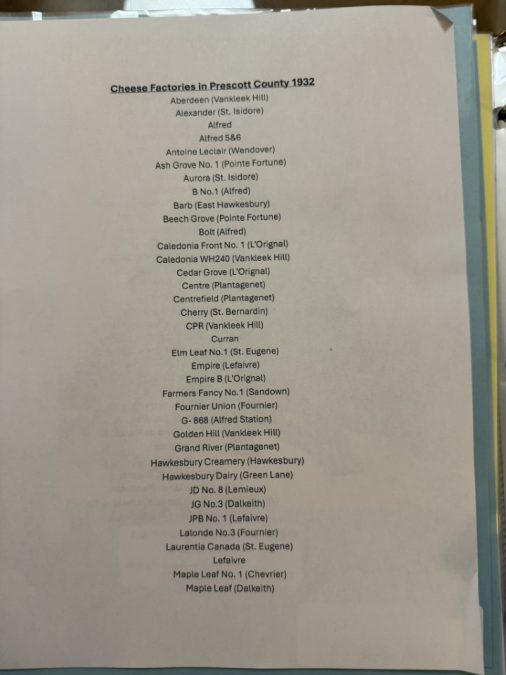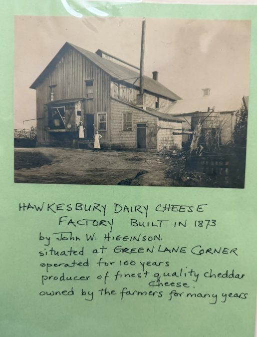 My uncle had moved to England as a young adult, and my father was recapitulating the scores of changes that had happened since my uncle left. Our first stop was for cheese and dry goods at the McCuaig Cheney general store and as usual there was the town porch-sitters catching up on all the news. Yet another cheese factory had opened in Ontario bringing the total to over 1,000! By 1911, Prescott County would have 71 factories, Glengarry 75 and Russell 64. Cheddar cheese was the most important agricultural export (largely to Britian) worth $20M and shipped wonderfully encased in wax. The popularity of these factories was largely due to farmers making a profit of $50/month with only 10 cows (Ayrshires or Durhams) to pay the mortgage on the farm. The first cheese factory in VKH was located on Agricultural Street and the Cheese Marketing Board in VKH was the largest in the dominion of Canada. By 1919 the government was grading cheese, and the ‘big cheese’ exhibits were popping up at the Vankleek Hill Fair! Thank goodness for William E N Byers who constructed a cooperative cheese factory at Brown’s Corners (now Greenlane) after sailing to England to establish the British market for Canadian cheese!