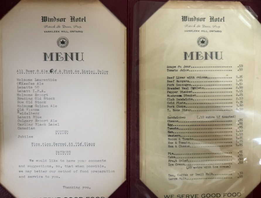 After selecting the headstone, we headed over to the Windsor Tavern for a much-needed draft. Father was saying that Joe St. Denis bought the tavern in 1908 and later changed the name to Windsor to honour the House of Windsor, the British Royal family. Joe said it was fine to reserve 4 rooms at $1.50 apiece complete with a meal for our family coming in. Business was thriving with travellers and horses stopping to lodge overnight between Montreal and Ottawa. The Windsor Tavern saw many changes through four generations and is today the longest family-run tavern in Canada. Horse sheds at the back of the tavern, spittoons, smoking, cursing, Friday and Saturday night fights and the ‘BLACK List’ barring poorly behaved patrons were built-in features. A separate ladies room allowed men only if they were escorted, Rooms #1 and #2 had writing rooms to conduct business and the closed verandah was a fine bedroom for the St. Denis’. Long term clients like Peter Granville who worked at The Norda were like family watching the Saturday night hockey match in the living room with all. And the night of the 1951 fire at Sinclair Supply- many took up pails of water to douse the roof from wafting embers that appeared. Thankfully, no damage. The Tavern stopped renting rooms in 1981-2 and today the bar and fridge doors are original inside this cherished watering hole.
