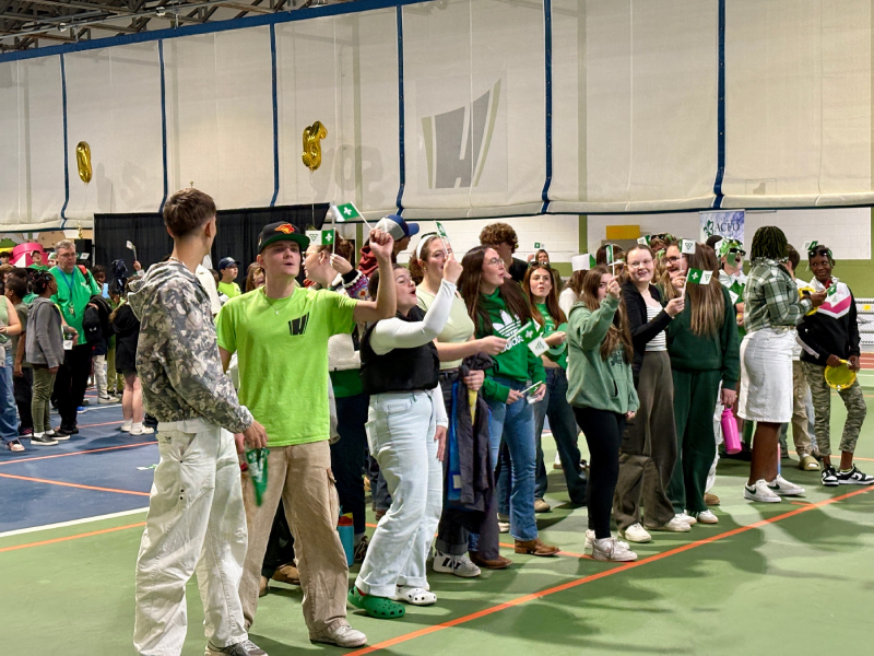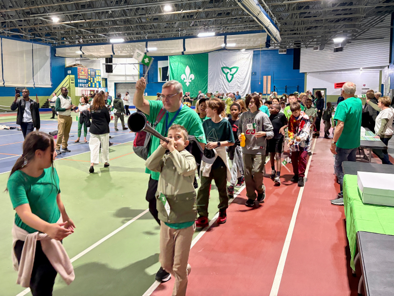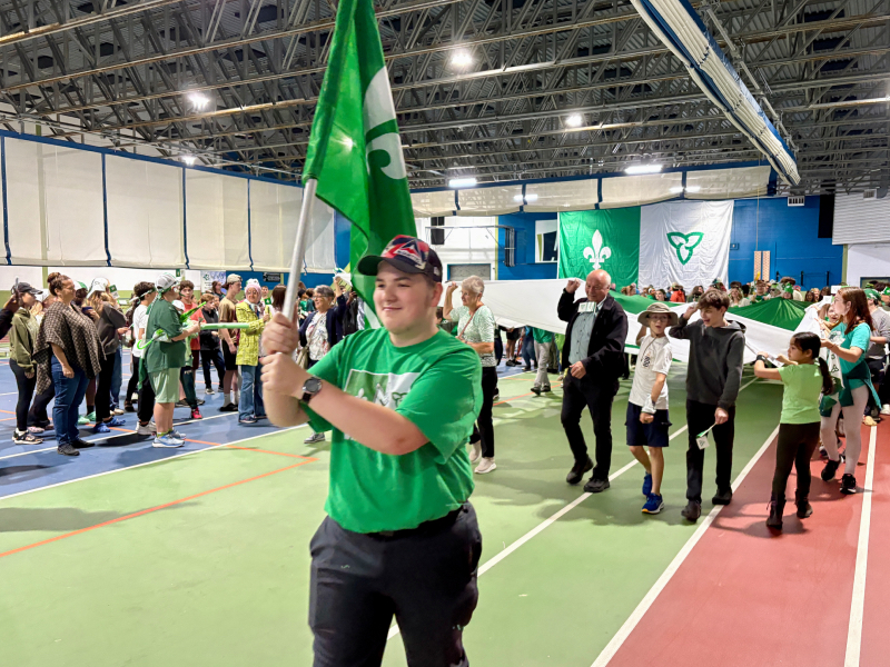Instead of a traditional flag-raising ceremony, students paraded a large Franco-Ontarian flag around the interior of the sports complex, filling it with cheers and song.
