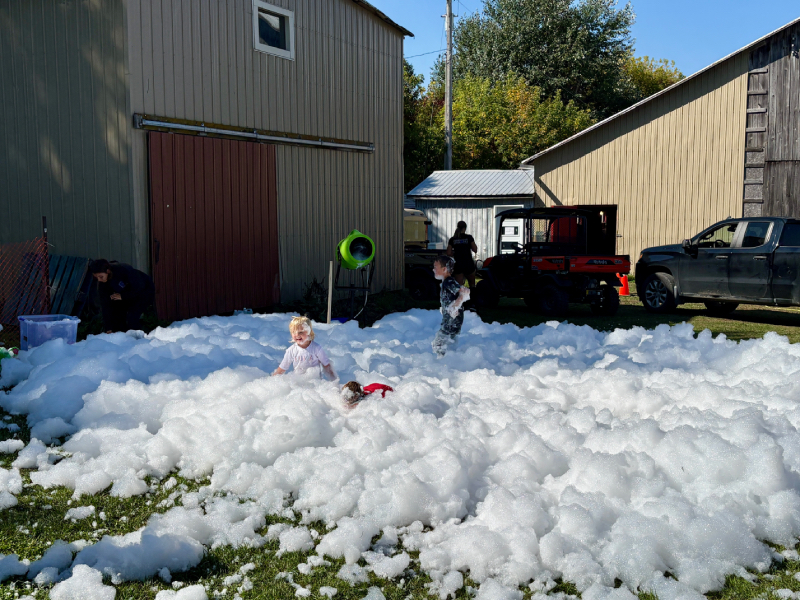 Young festivalgoers enjoyed inflatable pony-hop races, a foam pit, and the tractor hill play area, all set against the sights and sounds of life-sized tractors echoing across the grounds.