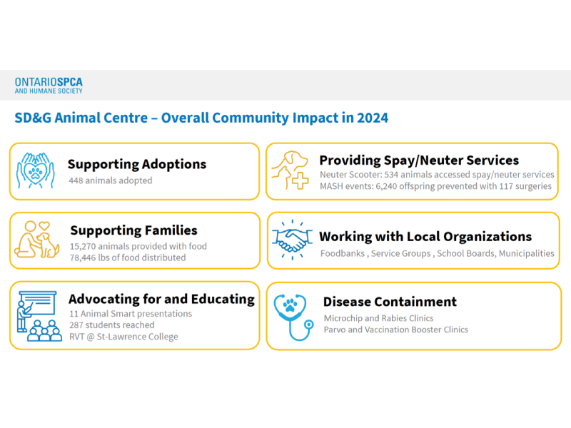 Bishop said that the Ontario SPCA has delivered more than 80,000 pounds of food to families in its service region. She also emphasized that the centre launched its Neuter-Scooter Program, which travels to high-volume neuter clinics and offers affordable spay-neuter services.