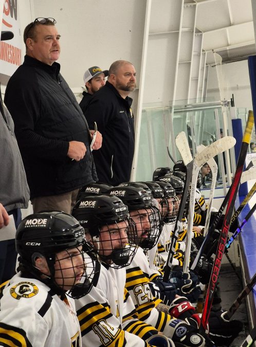 Vankleek Hill Cougars Head Coach Hamish Cunning (centre) looks on in the Cougars’ 3-1 win over the Cumberland Castors on Saturday, October 4. Photo: Reid Masson