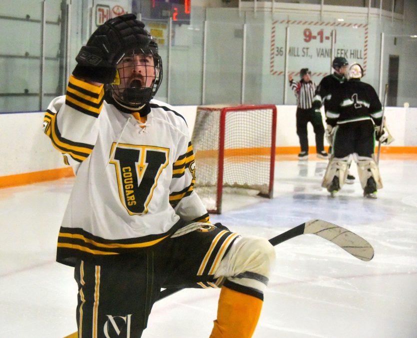 Cougars forward Garrett Cunning (23) celebrates after scoring early in the second period to give Vankleek Hill a 2-0 lead over the Metcalfe Jets on Saturday, November 8. Cunning’s marker stood up as the winning goal in Vankleek Hill’s 5-1 win. (Photo: Sylvain Lauwers)