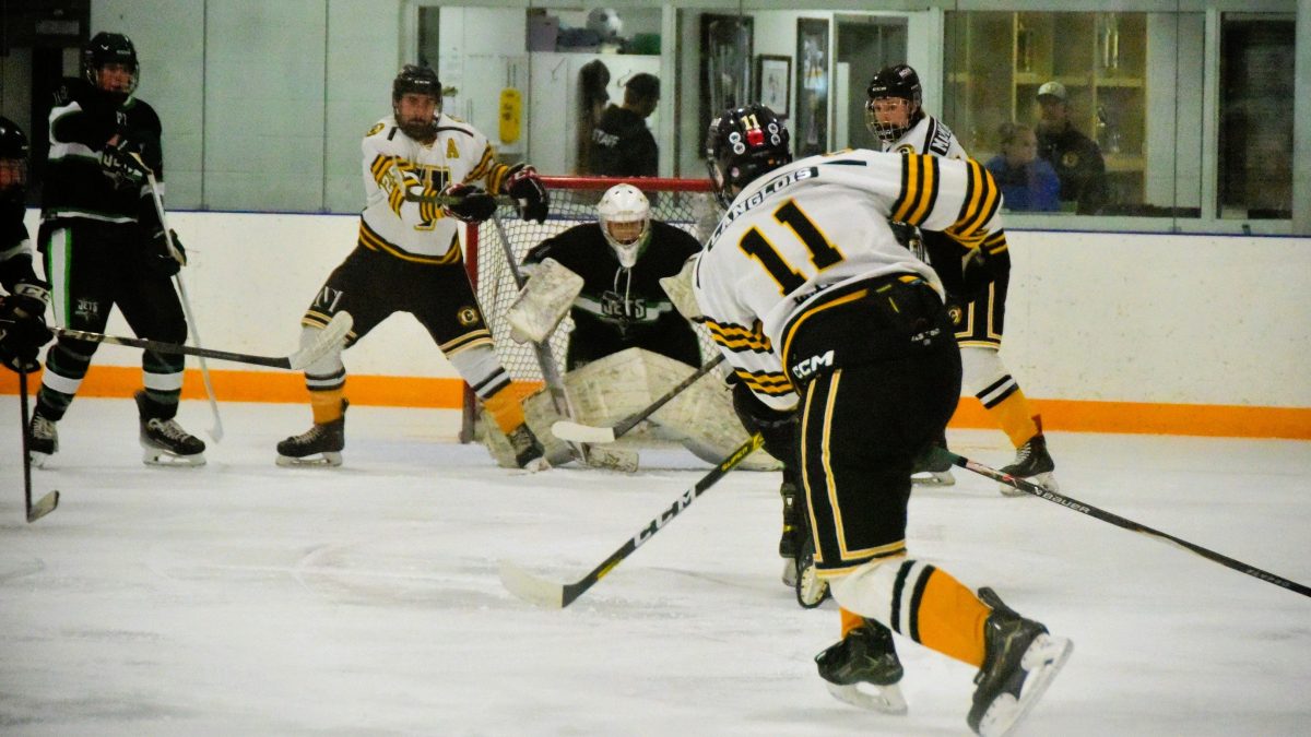 Vankleek Hill Cougars defenseman Zack Langlois (11) fires a shot on Metcalfe Jets netminder Cedric Nadon, as Cougars forward Connor Cook (25) looks for a deflection in the Cougars’ 5-1 win over the Jets on Saturday, November 8. (Photo: Sylvain Lauwers)