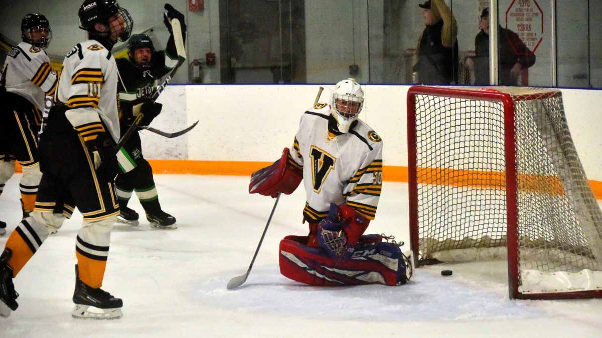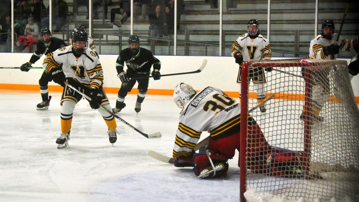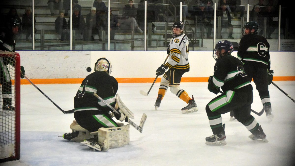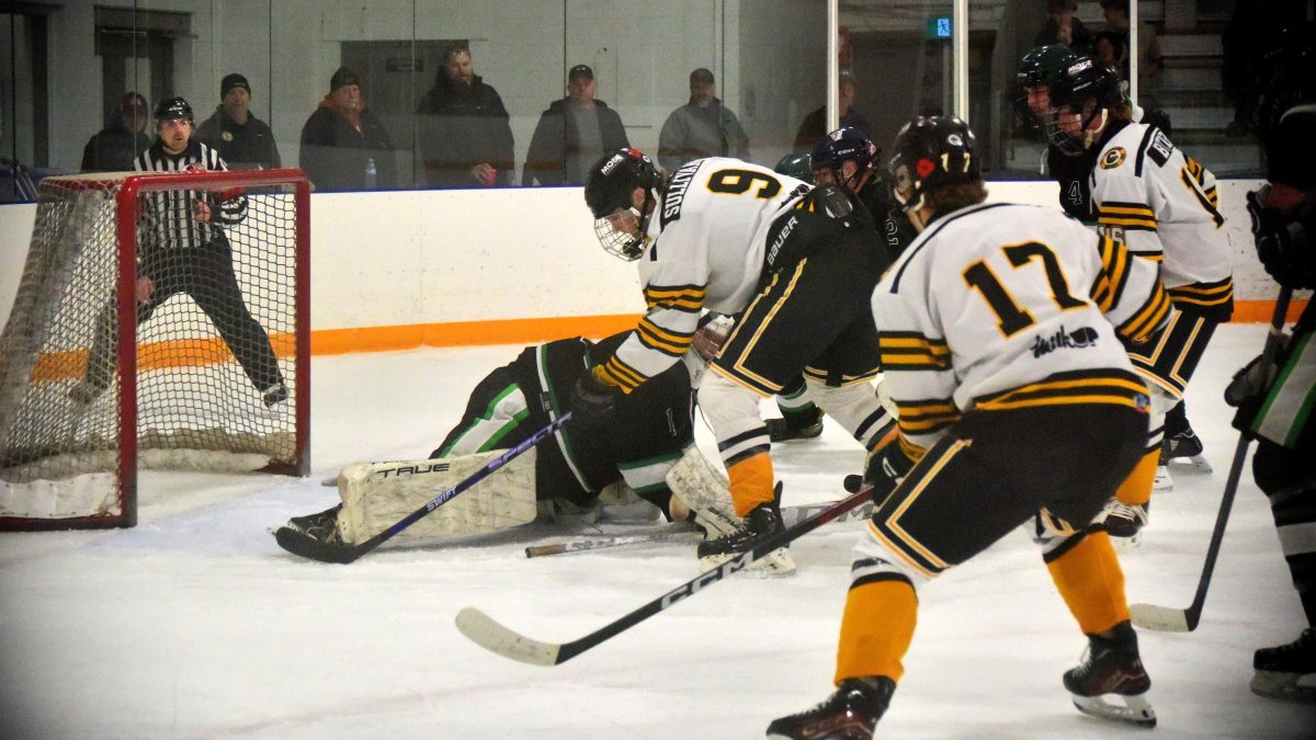 Vankleek Hill’s Zachary Sullivan (9), Ryan Wolowicz (17) and Ethan Butler (16) storm Metcalfe Jets netminder Cedric Nadon, in the Cougars’ 5-1 win on Saturday, November 8. (Photo: Sylvain Lauwers)