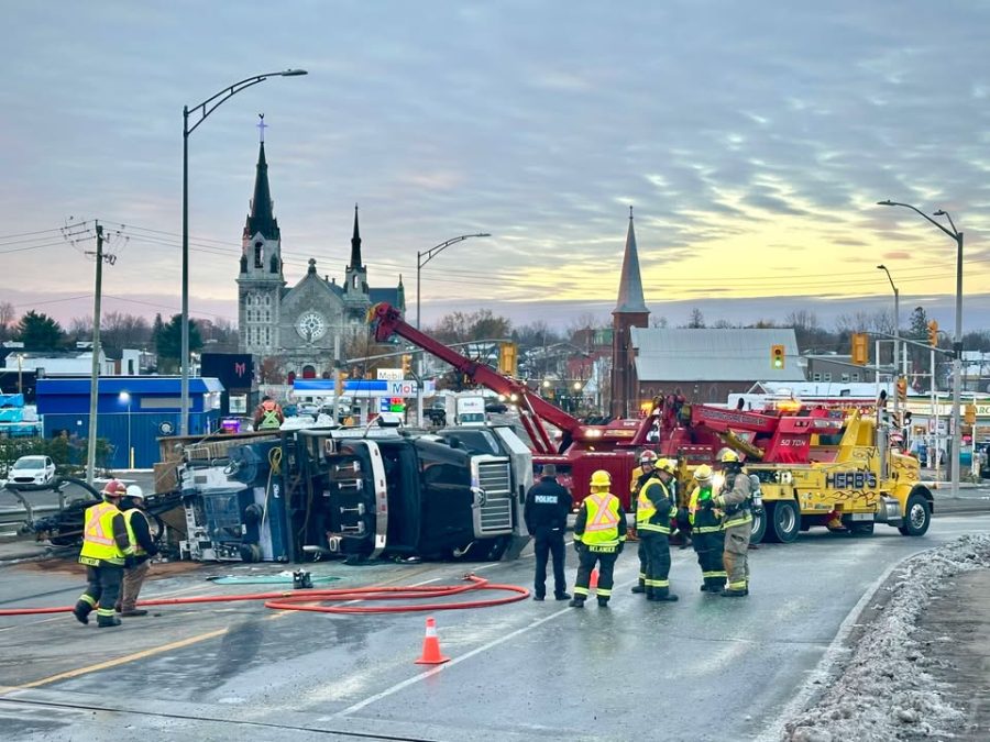 At around 4:20 a.m., officers with the Hawkesbury Detachment of the Ontario Provincial Police (OPP) responded to the intersection. A box truck had flipped onto its side, blocking the road.