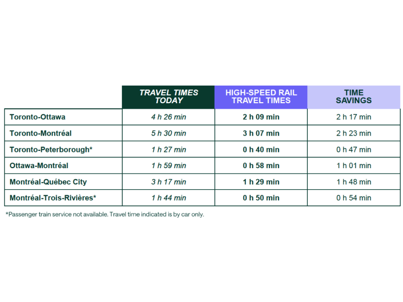 Inter-city stations are planned at seven major hubs in Ontario and Québec: Toronto, Peterborough, Ottawa, Laval, Montréal, Trois-Rivières, and Québec City. The train will operate on nearly 1,000 kilometres of dedicated, electrified track, reaching speeds of more than 300 km/h and serving more than 24 million people.