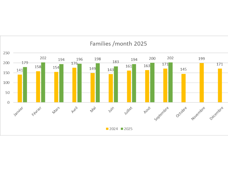 This graph shows the number of families who visited AFB over the past year, with 2024 numbers in yellow and 2025 numbers in green. Gareau said the number of families using the food bank has risen by 23 per cent compared to last year.